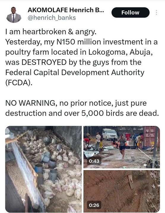 Akomolafe Henrich Banks, an entrepreneur based in Abuja, has lost his N150 million poultry farm due to a demolition carried out by the Federal Capital Development Authority (FCDA). The demolition occurred on Sunday, approximately four months after Banks had publicly endorsed similar demolition activities in Lagos State.