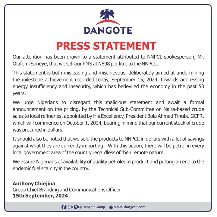 Dangote Refinery has hit out at the Nigerian National Petroleum Company Limited (NNPCL) for claiming they bought fuel from them at N898 per litre.