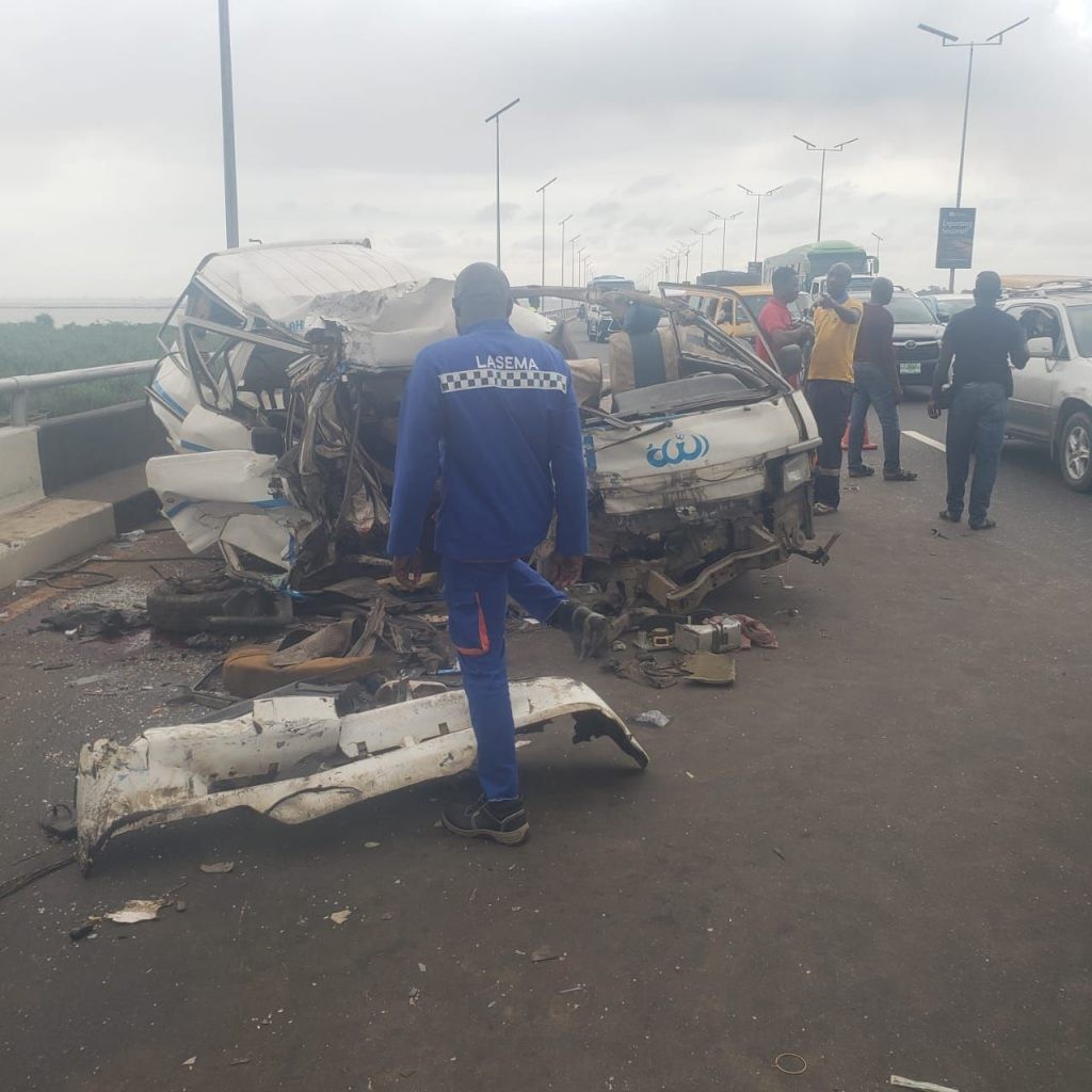 “A tragic and fatal head-on collision involving two Mazda commercial buses (LND 624 YE / EKY 804 YH) occurred on the Third Mainland Bridge, near Ilaje, en route to Iyana-Oworonsoki, resulting in one fatality and leaving eight others grievously injured. The harrowing incident, which unfolded as both buses recklessly engaged in a high-speed chase from Adeniji Adele serves as a stark reminder of the catastrophic consequences of irresponsible driving practices.