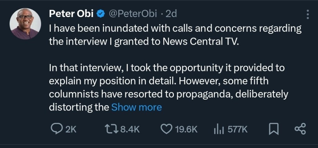 “I have been inundated with calls and concerns regarding the interview I granted to News Central TV. In that interview, I took the opportunity it provided to explain my position in detail. However, some fifth columnists have resorted to propaganda, deliberately distorting the narrative.
