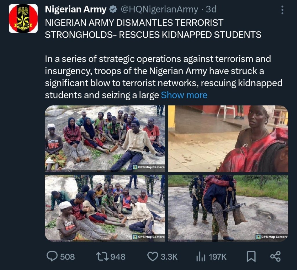 In a statement on the X media platform, formerly known as Twitter, the Army reported that on 17 September 2024, troops on a sting operation in Kaduna State, acting on credible intelligence, intercepted terrorists attempting to cross from Alawa Forest in Niger State to Birnin Gwari in Kaduna State.