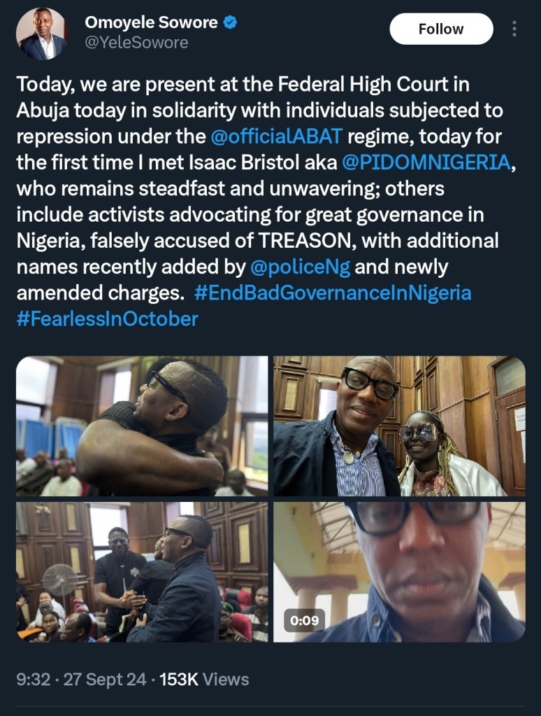 “Today, we are present at the Federal High Court in Abuja today in solidarity with individuals subjected to repression under the @officialABAT regime, today for the first time I met Isaac Bristol aka, @PIDOMNIGERIA, who remains steadfast and unwavering; others include activists advocating for great governance in Nigeria, falsely accused of TREASON, with additional names recently added by @policeNg and newly amended charges. #EndBadGovernanceInNigeria #FearlessInOctober“