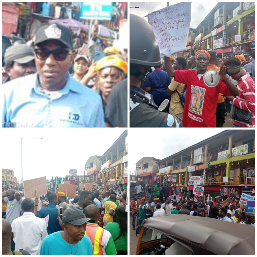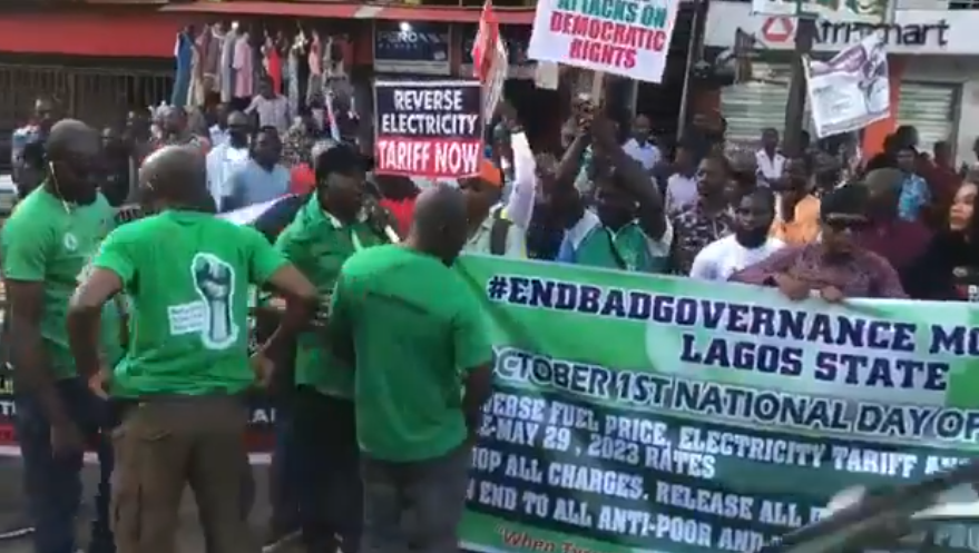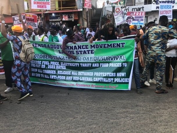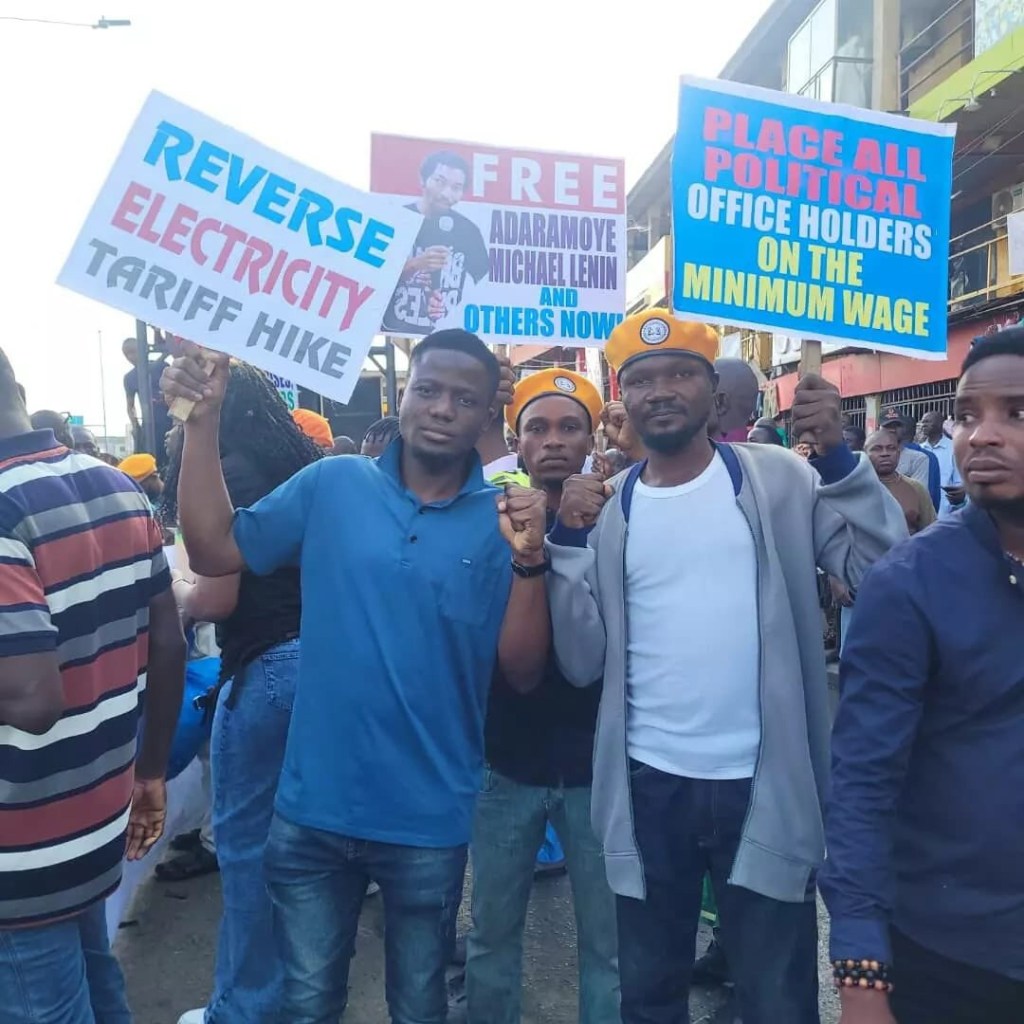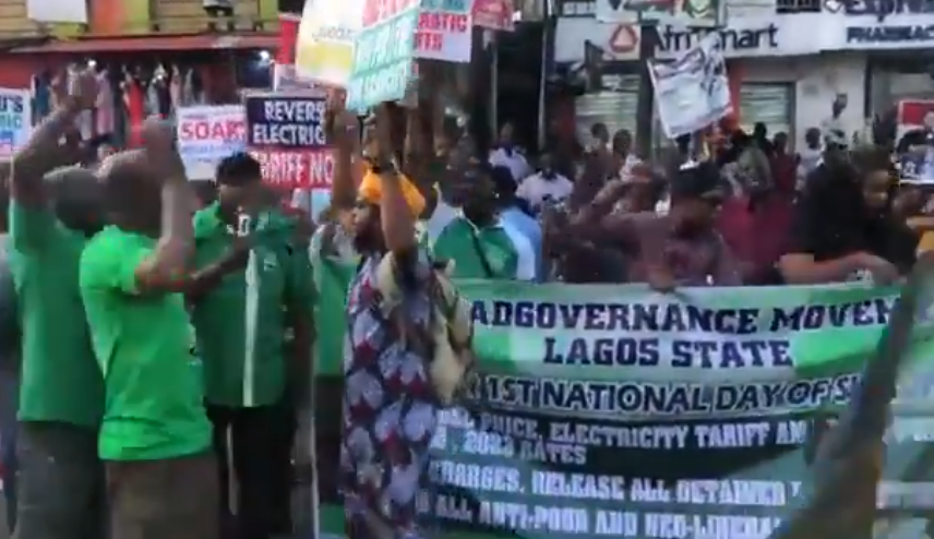 In Lagos state, the protesters have gathered at the Ikeja Underbridge and are currently chanting solidarity songs, displaying placards bearing inscriptions such as “Reverse electricity tariff now, “End all attacks on democratic rights”, “Reduce petrol price to N197 per litre; end scarcity”, and “Profit soars while people suffer.”