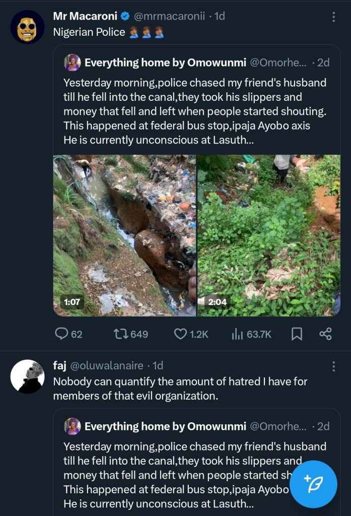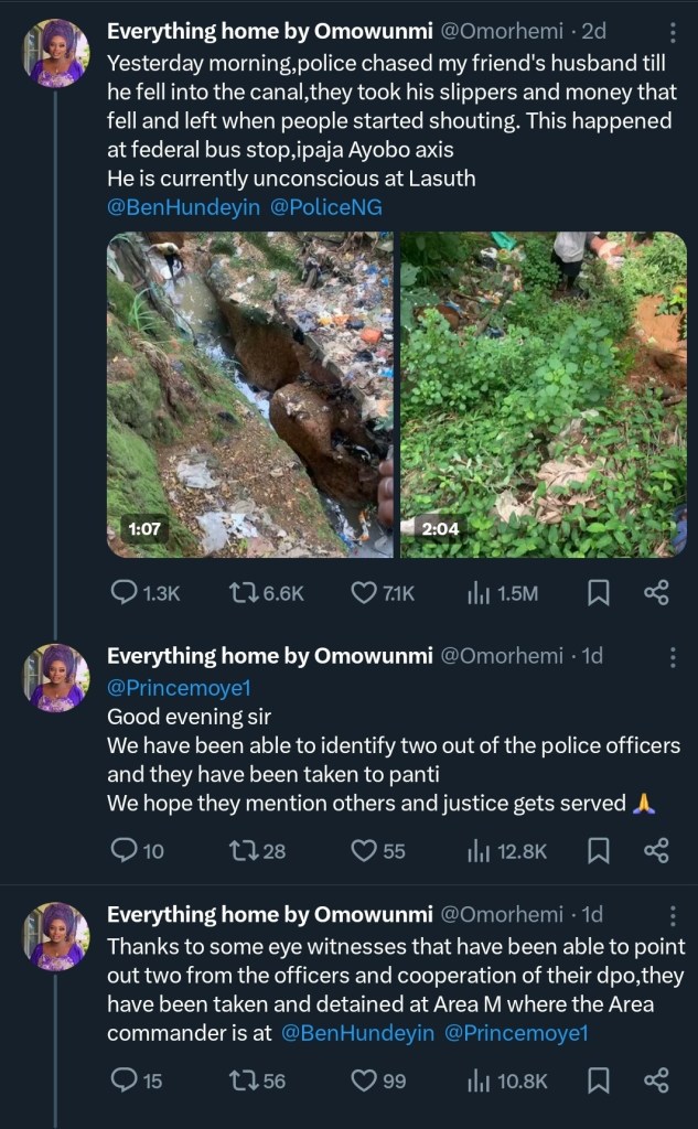 “Yesterday morning, the police chased my friend’s husband till he fell into the canal. They took his slippers and money that fell and left when people started shouting. This happened at the Federal Bus Stop, Ipaja, Ayobo axis. He is currently unconscious at LASUTH.